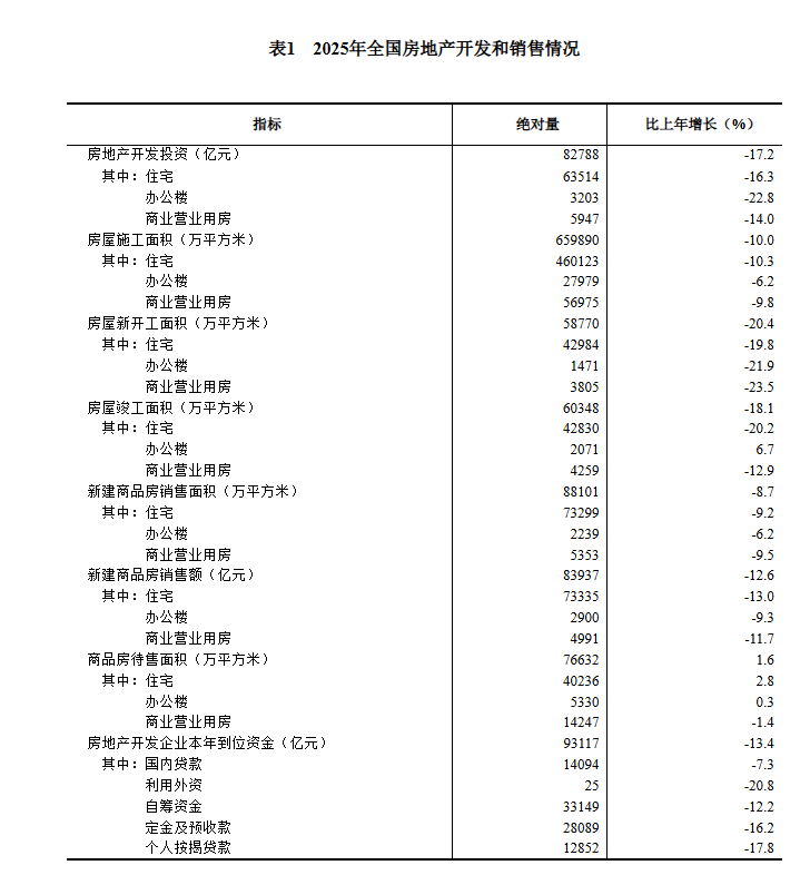 2025年,全國房地產(chǎn)開發(fā)投資82788億元,比上年下降17.2%(按可比口徑計算,詳見附注6);其中,住宅投資63514億元,下降16.3%。