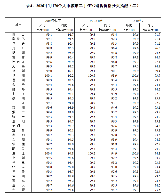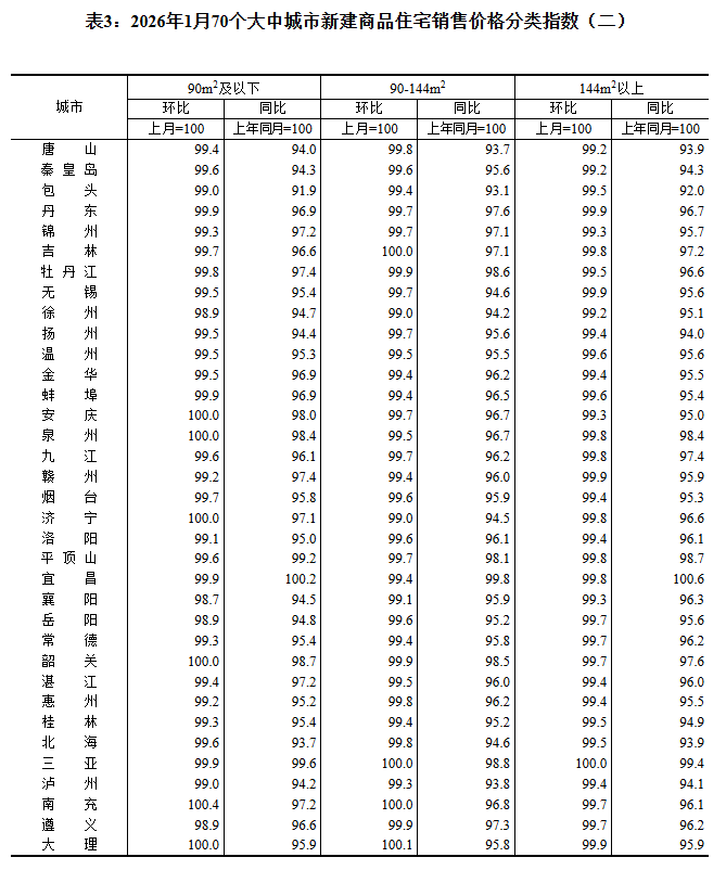 2026年1月份70個(gè)大中城市商品住宅銷售價(jià)格變動(dòng)情況
